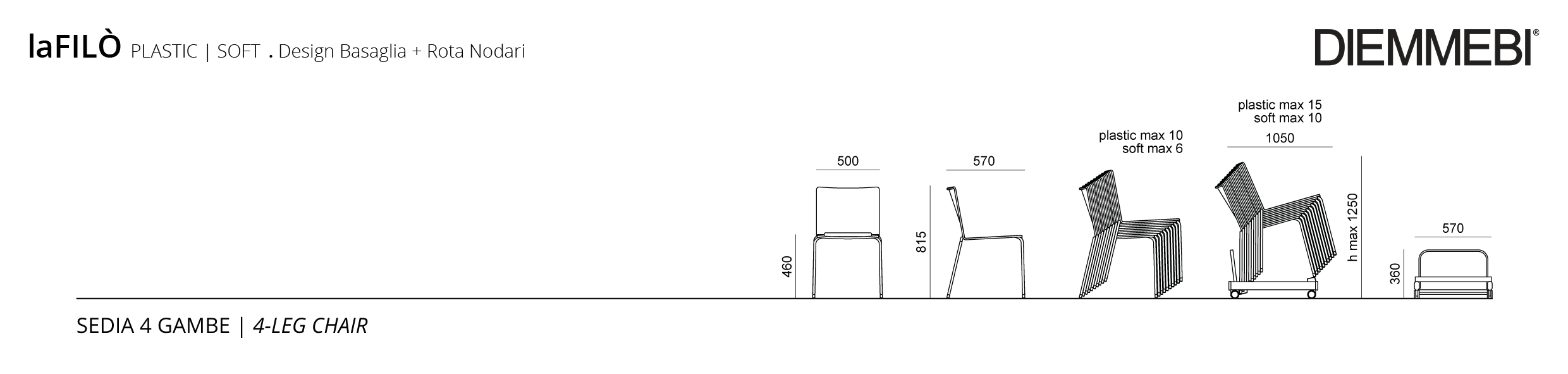- Impilabile a terra fino a 10 sedie.